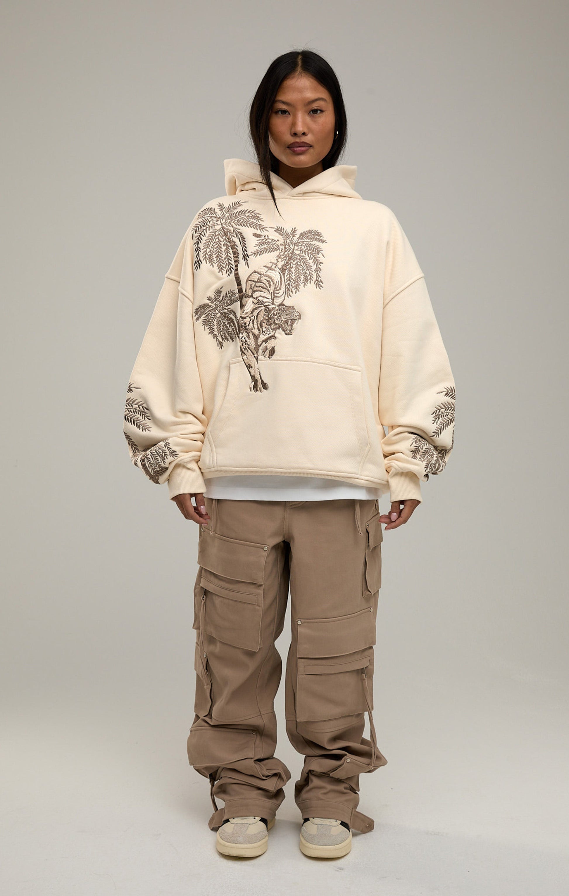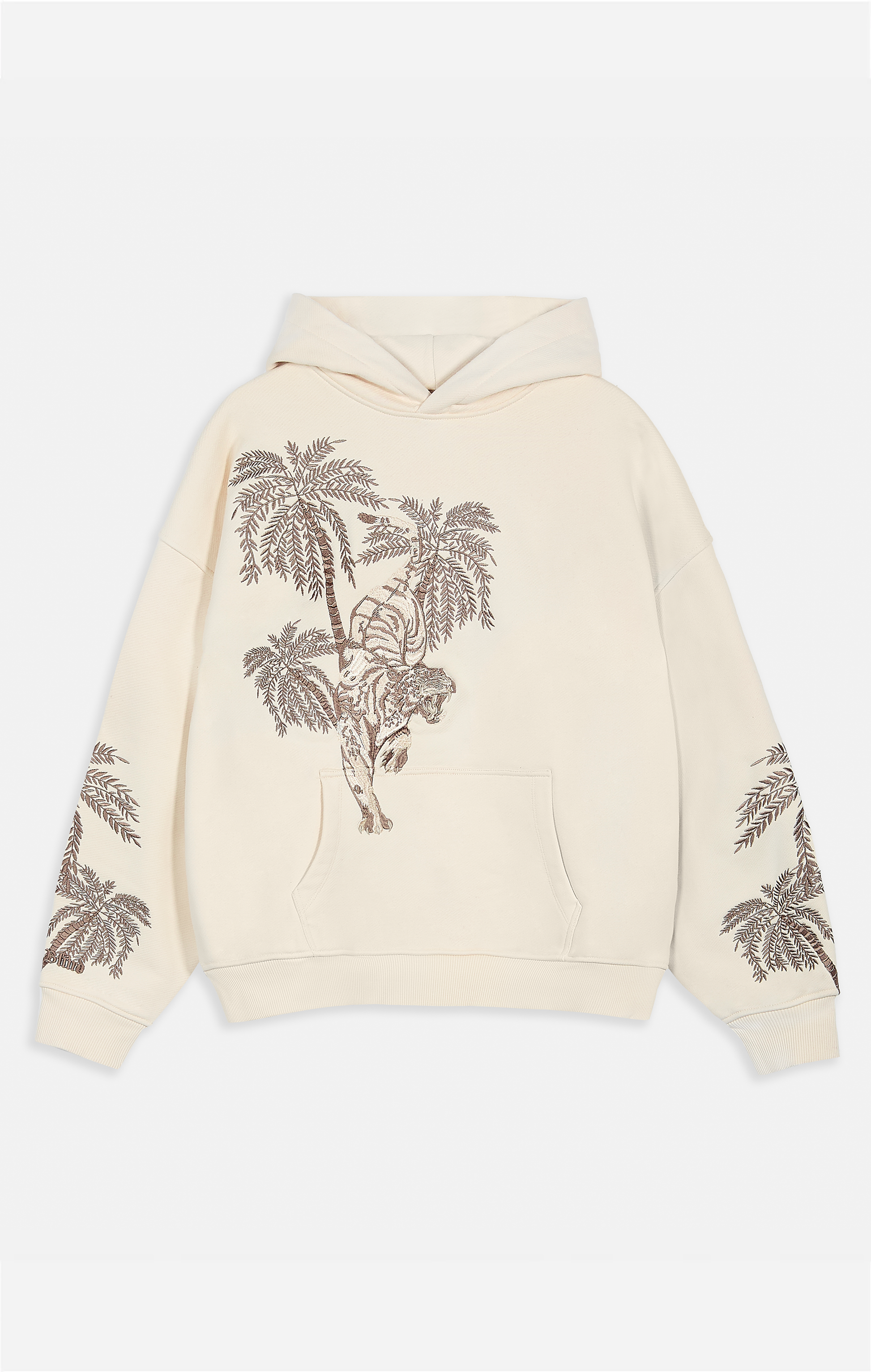 Embroidered palm tree motifs wrap around the sleeves, adding depth and movement to the silhouette, while the oversized fit and soft structure give a relaxed yet premium drape. As one of the most technically detailed pieces in the collection, the Sandstorm Tiger Hoodie stands as a collector’s item for those who appreciate timeless streetwear infused with craftsmanship and storytelling.